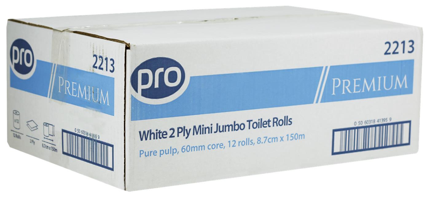 Toilet Paper Back to Mini Jumbo Toilet Rolls PRO Mini Jumbo 2 Ply White Toilet Tissue 150m (60mm core) PRO Mini Jumbo 2 Ply White Toilet Tissue 150m (60mm core) Pure pulp, boxed rolls Out of stock Code 2213 Login to find out more